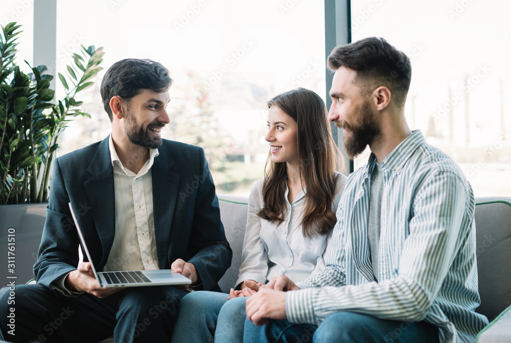 Insurance broker consulting clients in modern office. Young couple choosing house at real estate agency. Financial advisor holding laptop, talking with people, meeting, discussing, deal