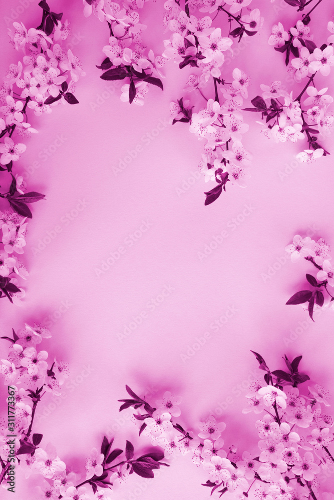 Spring or summer background.Pink flowering tree branches on the pink background. Top view. Copy space. Location vertical.