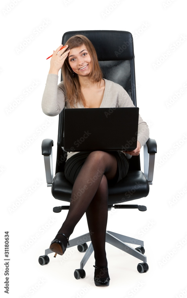 Young business lady in a chair with a laptop