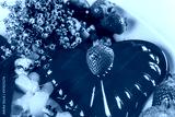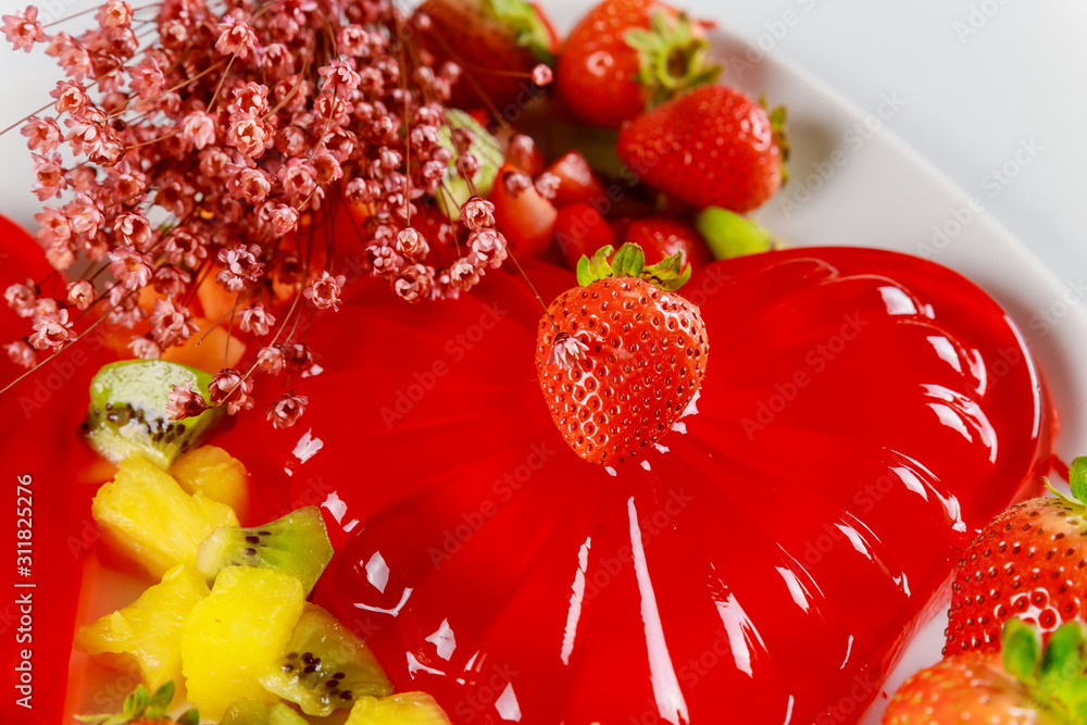 Heart shape strawberry gelatin with fruits and flowers on Valentines Day.