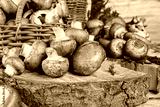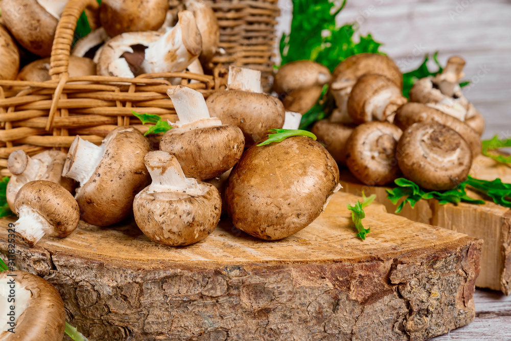 Brown mushrooms in wooden wicker baskets on wooden background.
