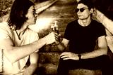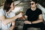 Two Stylish Twins Brothers Having Fun Drinking Beer on the Stairs