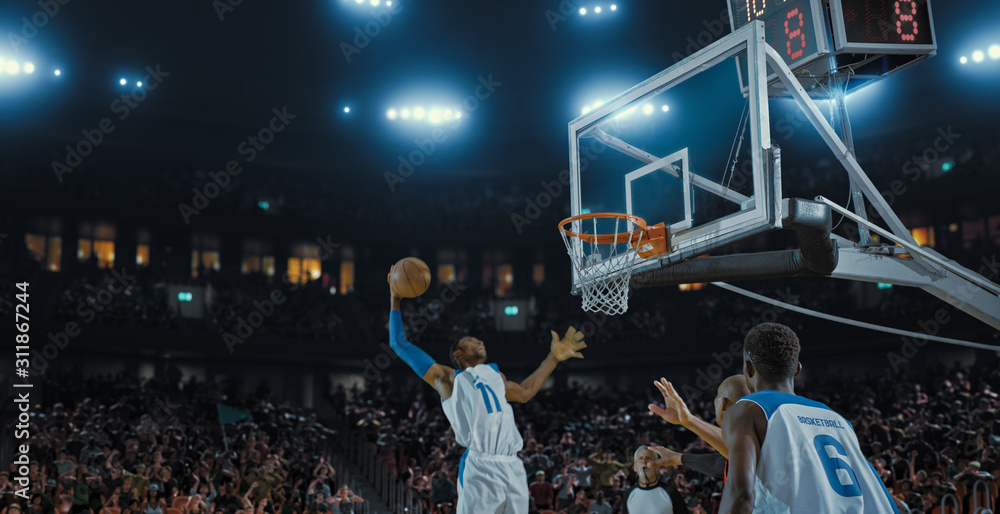 Basketball players on big professional arena during the game. Tense moment of the game. Celebration