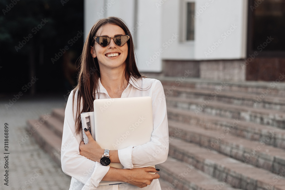 Portrait of One Fashionable Girl Dressed in Jeans and White Shirt Holding Laptop, Freelance Worker, Business Lady, Woman Power Concept