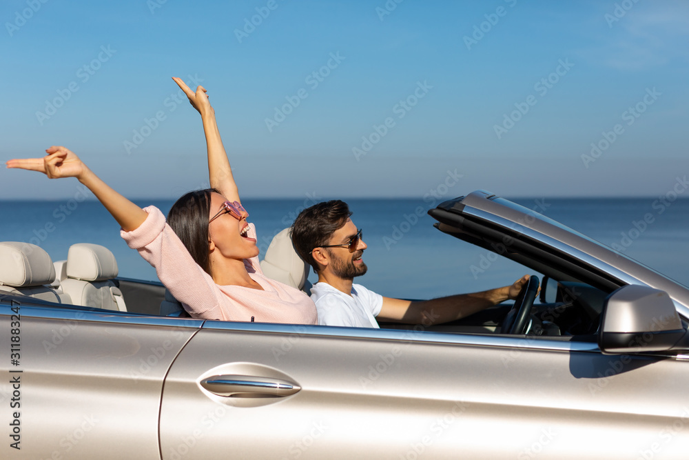 side view of happy woman holding hands up sitting in cabriolet with boyfriend