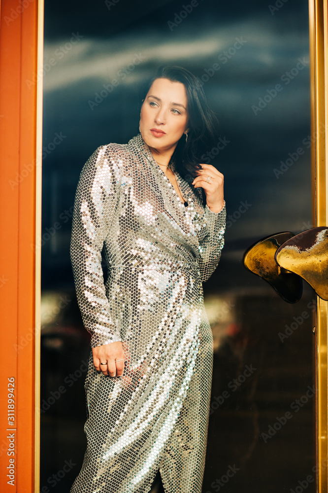 Portrait of beautiful brunette woman wearing silver sequine dress
