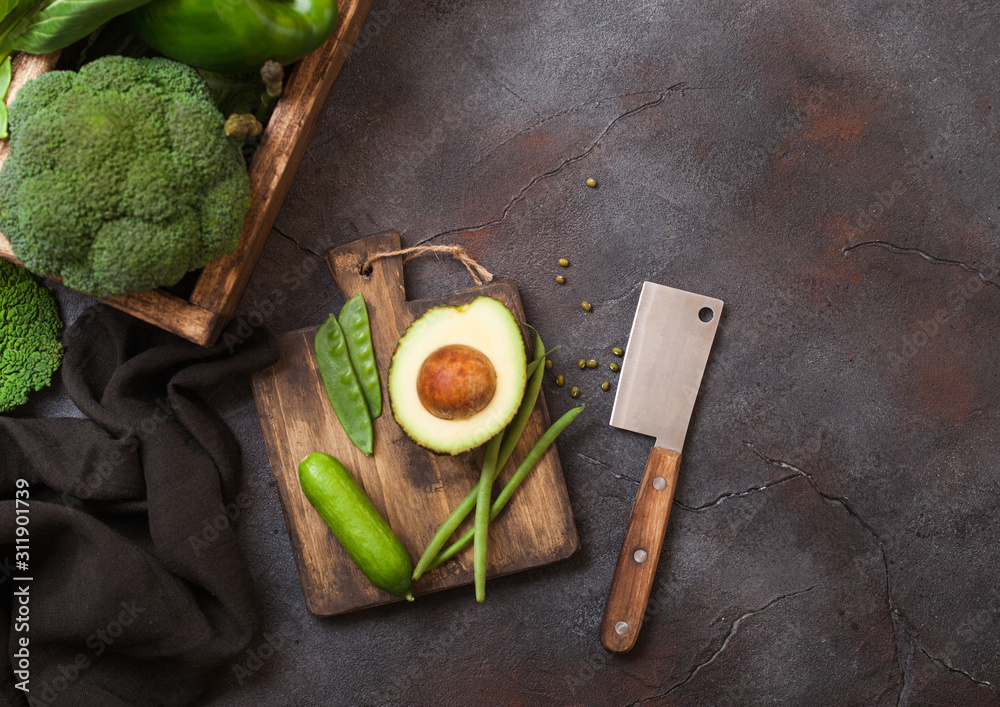 Assorted green toned raw organic vegetables in wooden box on dark background. Avocado, cabbage, cauliflower and cucumber with trimmed and mung beans and chopping board with knife.