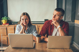 Charming freelancer working with serious partner in cafe
