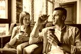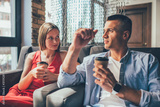 Trendy man and woman having coffee chilling in armchairs