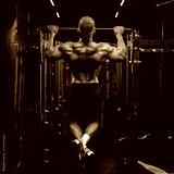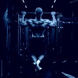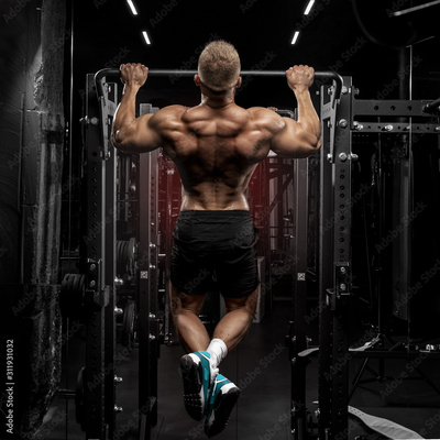 power muscular bodybuilder guy doing pullups in gym. Fitness man pumping up lats muscles. Fitness and bodybuilding training health lifestyle concept