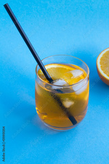 Aperol spritz cocktail in the glass on the blue background. Location vertical. Closeup.