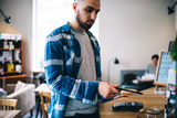 Man paying with smartphone in cafe