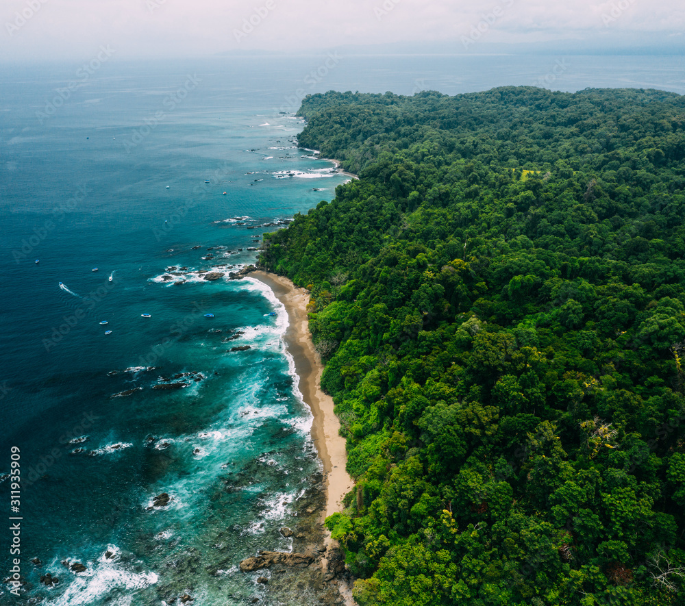 Aerial Drone View of a tropical island with lush jungle in Costa Rica, Isla del Caño