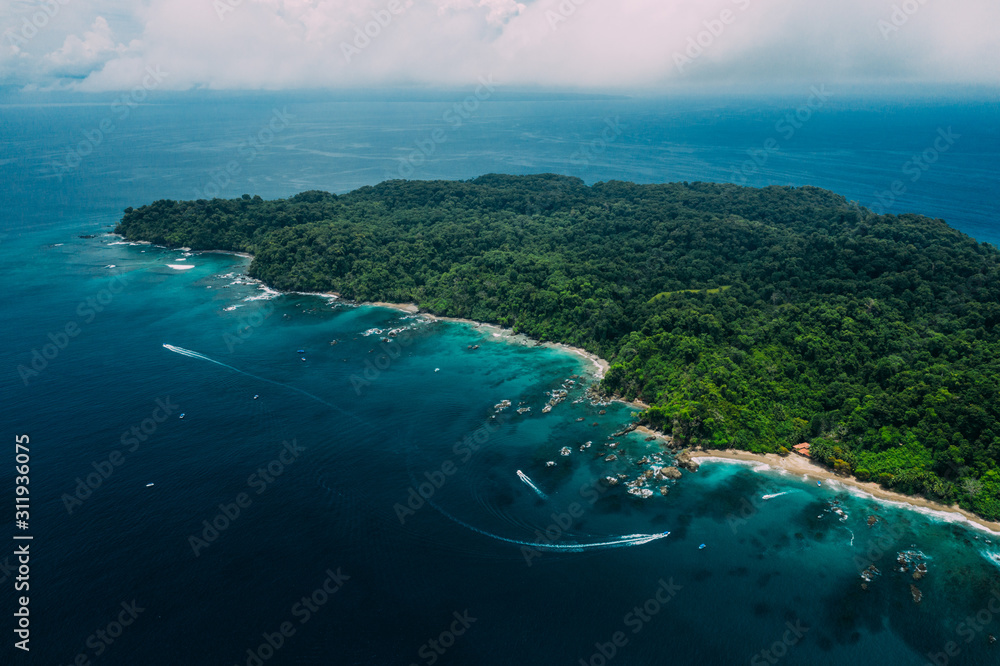 Aerial Drone View of a tropical island with lush jungle in Costa Rica, Isla del Caño