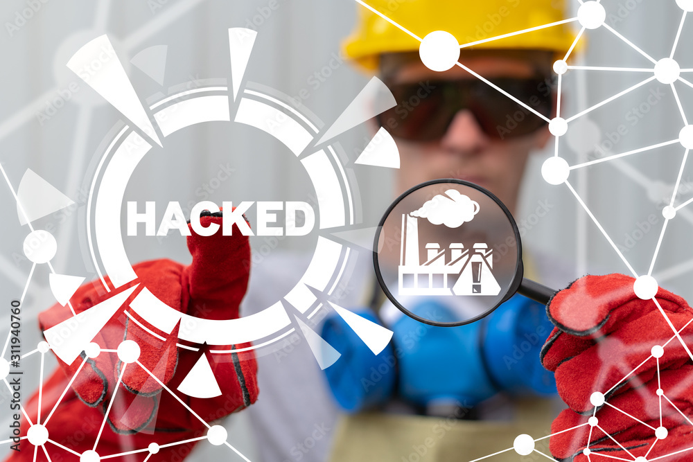 Hacked Data Industry Factory Computer Automation System. Industrial Alarm Attention Emergency Mode Concept.