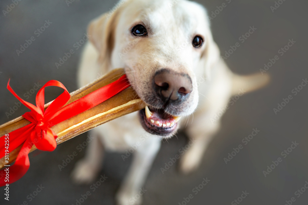 Labrador accepts a gift with a ribbon. Bone with a festive ribbon. Gift to the dog. A treat for a birthday Labrador. Labrador with a bone waiting at home. Funny dog eats mouth-watering pleasure.