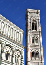 Campanile di Giotto and Battistero di San Giovanni from Piazza del Duomo with blue sky. Florence, Italy.
