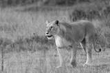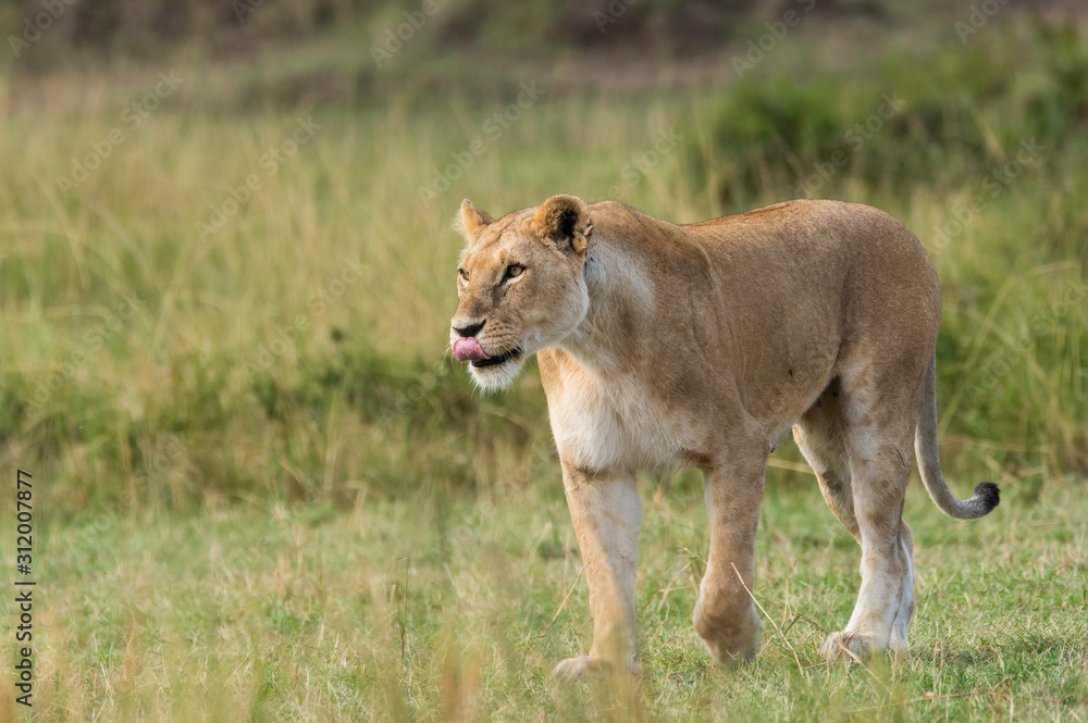 A lioness walking in the plains of Africa inside Masai Mara National Reserve during a wildlife safari