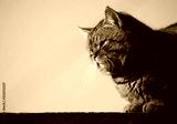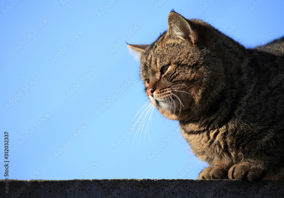 Fat сat with thick cheeks and dense wool is sitting on the fence on the blue background. A well-fed cat is looking at something you can add. Mock-up with furry cat with the long mustache