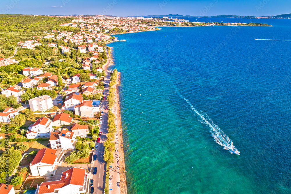 Zadar. Village of Diklo beach and coastline in Zadar archipelago aerial view