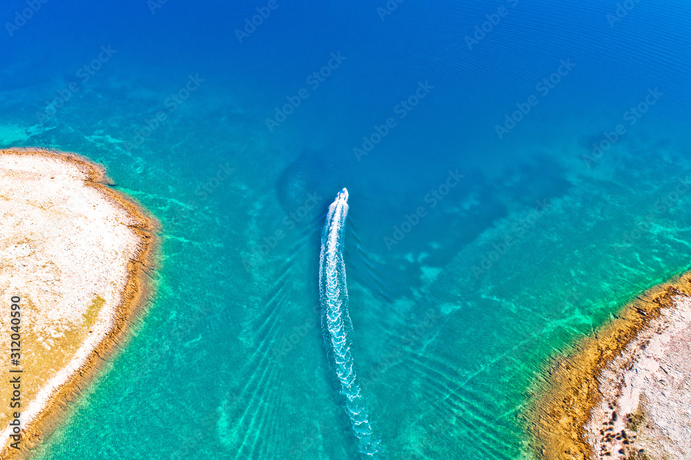 Archipelago of Croatia speed boat on turquoise sea, stone desert islands of Zadar