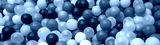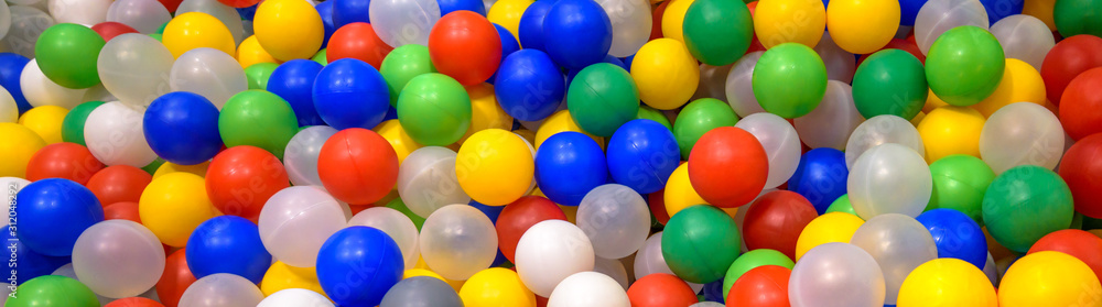 Colorful plastic balls background, top panoramic view of playground dry pool