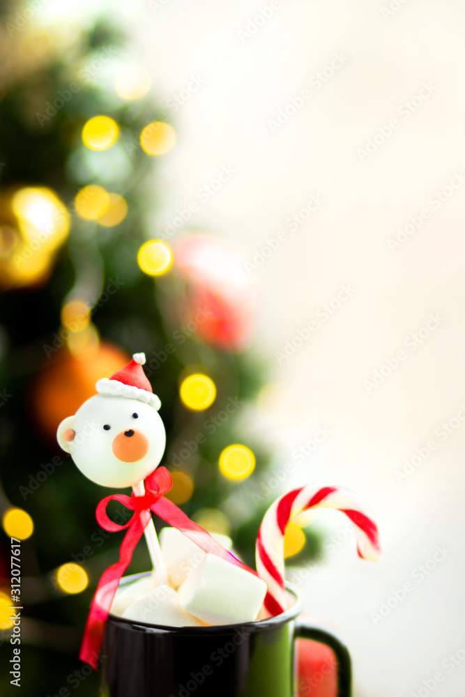 Christmas lollipops in a cup with Christmas decorations on a table on a light background. Gingerbread in the form of a minishka in a New Year's hat. Postcard