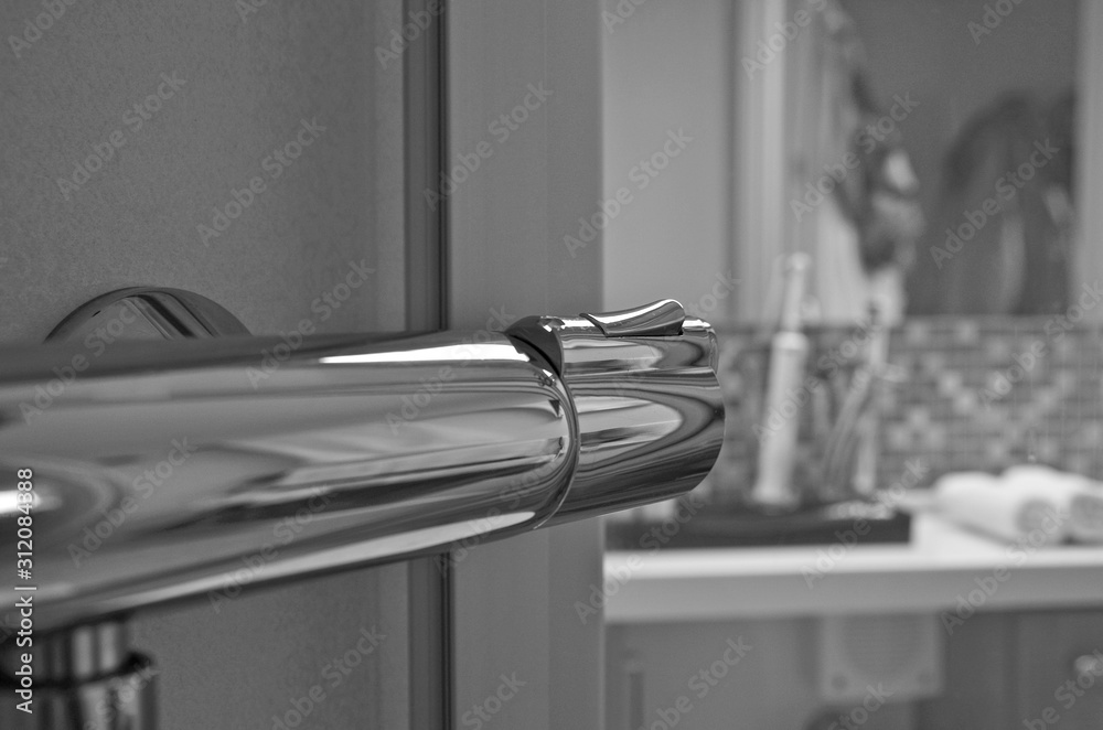 Modern design bathroom with sink, shower, towels and mirror and mosaic tiles in cabin or stateroom on Celebrity Cruises luxury cruise ship liner