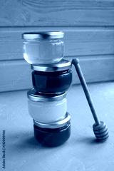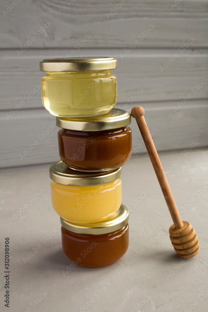Different varieties of honey in small glass jars on the grey background. Location vertical. Closeup.