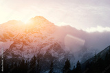 Sunny Winter Mountain Landscape with Blowing Snow.