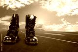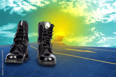 A pair of combat boots on an asphalt road . Concept for hard work to success.