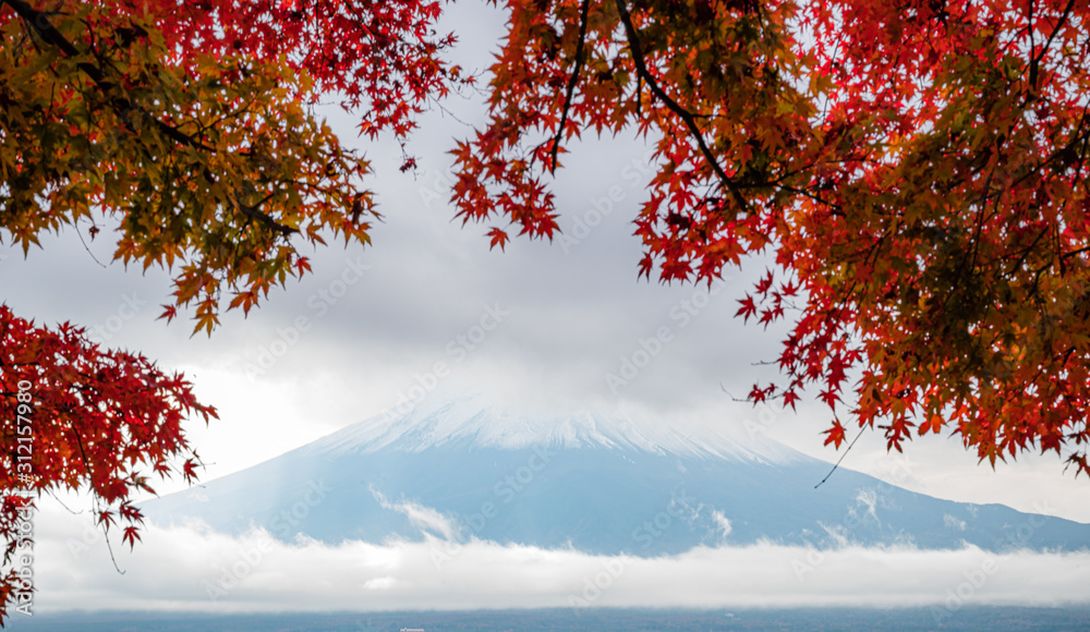 Landscape of Fuji mountain with maple leaf in Autumn season at Kawaguchiko lake with clouds background.