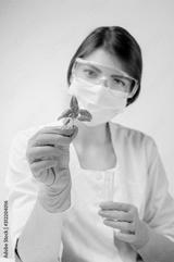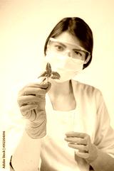 laboratory assistant holding a test tube with a plant basil agro-laboratory