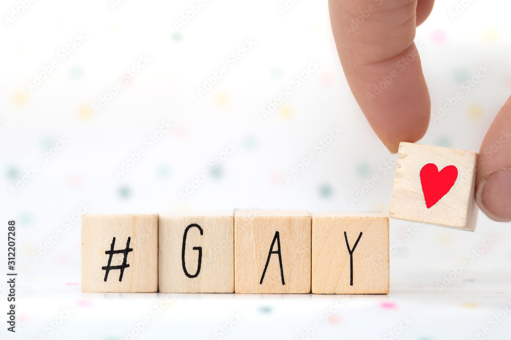Wooden cubes with a hashtag and the word Gay, social media concept