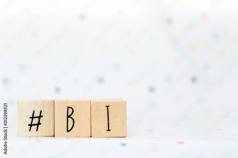 Wooden cubes with a hashtag and the word Bi and Gay, social media concept