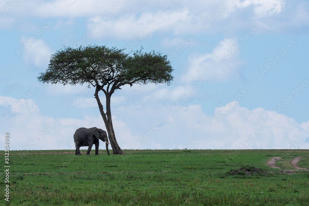 A lone elephant grazing next to a lone acacia tree in the plains of Africa inside Masai Mara National Reserve during a wildlife safari