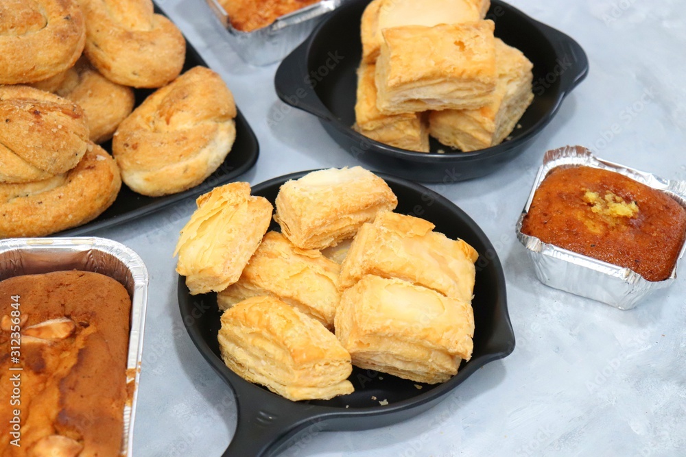 Assorted bakery products or Indian tea time snacks flatlay. sponge almond cakes, puffs, biscuits, horse shoe sugar cookies, Khari, Jeera butter, cupcakes.