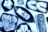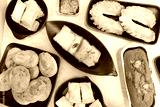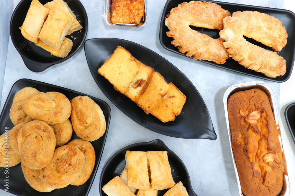 Assorted bakery products or Indian tea time snacks flatlay. sponge almond cakes, puffs, biscuits, horse shoe sugar cookies, Khari, Jeera butter, cupcakes.