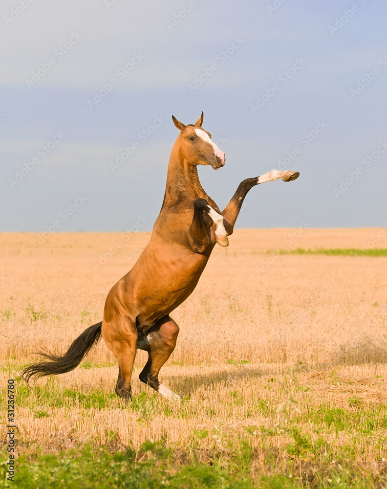 bay akhal-teke stallion on the field