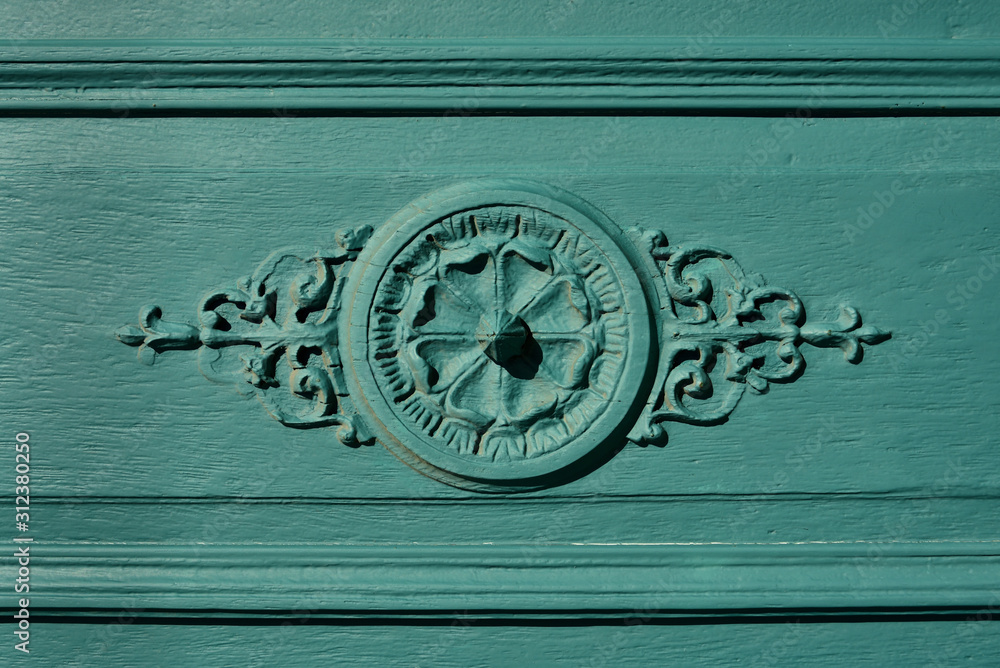 Background and detail of a historical floral ornament, which shows traces of age and weather influences on a weathered wood with green color, which is also weathered