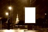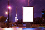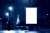 Vertical advertising billboard urban . city format in the purple night city. Luminous advertising field Mockup. landmark in the background tower