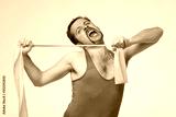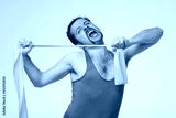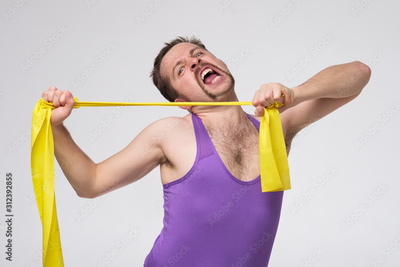 Male athlete in sportswear stretching band loop with hands preparing for productive workout training