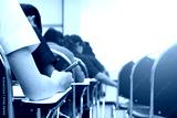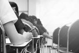Hands university student holding pen writing /calculator doing examination / study or quiz, test from teacher or in large lecture room, students in uniform attending exam classroom educational school.
