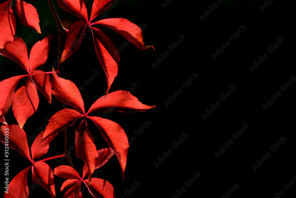 Wild red wine grows on the left edge of the picture in autumn, against a dark background with plenty of space for text
