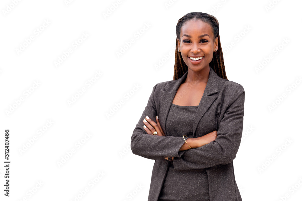 Portrait of a happy African American female company leader, CEO, boss, executive, isolated on white background