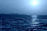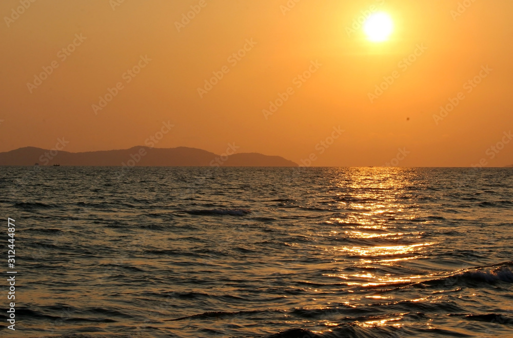 Silhouette of a tropical island with the bright golden sun setting and reflecting sunlight on the ocean for a summer holiday background concept.