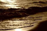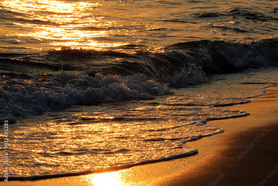 Bright golden sunlight reflecting on a tropical ocean with gentle waves breaking onto the beach for a summer vacation background concept.