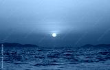 View of distant tropical islands across the ocean with the orb of the setting sun in the sky for a summer holiday background concept.