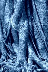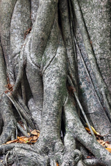 Gnarled trunk and roots of an old tropical tree in south east Asia