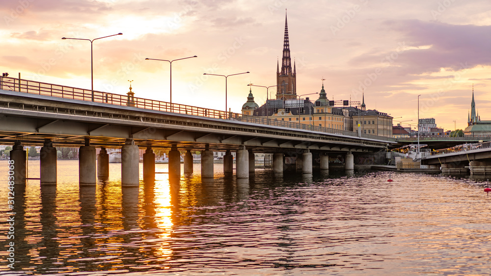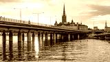 Sweden, Stockholm, Södermalm, Katarina-Sofia, sunset through the central bridge